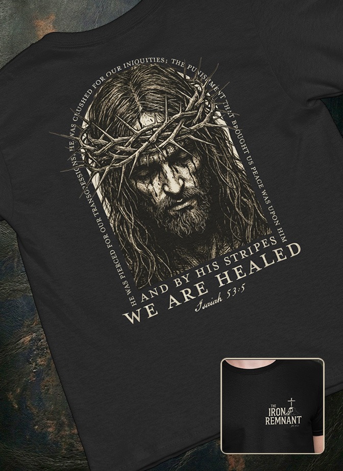 Modern culture often treats the cross as jewelry. This design restores the gravity of the sacrifice. Featuring a detailed, woodcut-style illustration of the Suffering Servant, it visually anchors the prophecy of Isaiah 53:5—written centuries before the crucifixion took place.