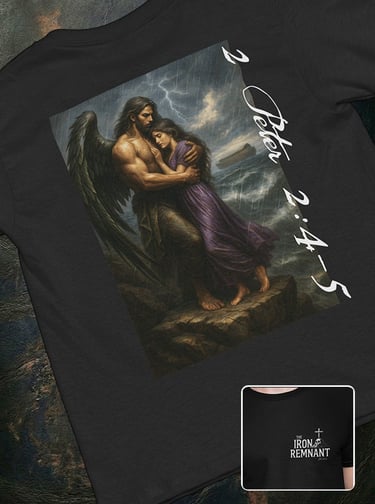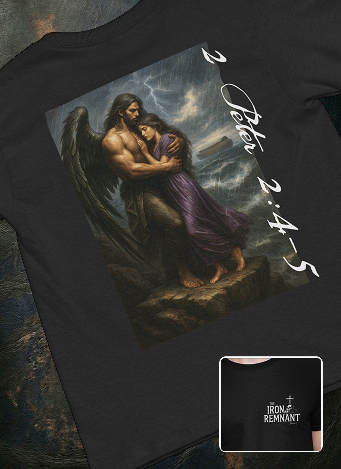 This design illustrates the catalyst of the catastrophe: The Watchers of Genesis 6 leaving their proper estate to corrupt the seed of mankind. It captures the forbidden union that birthed the Nephilim, with the Ark rising in the distance as the only escape from the coming judgment.